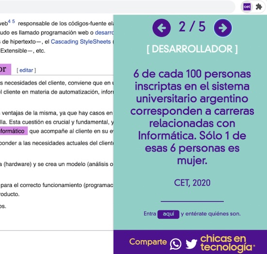 #MásDatos es una extensión para Chrome, creada por Chicas en Tecnología para resaltar palabras vinculadas a carreras en STEM y mostrar datos sobre la brecha de género.